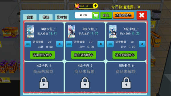 3、进入进货界面,查看可购入商品(如N级卡包_1进价13.71、N级卡包_2进价11.70等),根据资金情况和市场价格变动,选择合适商品。