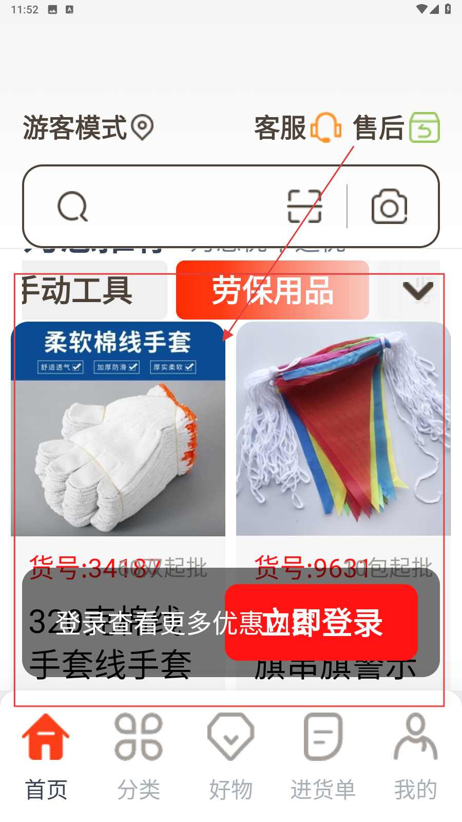 3、在劳保用品页面,查看商品(如柔软棉线手套、旗串旗警示),点击需要的商品即可购买。