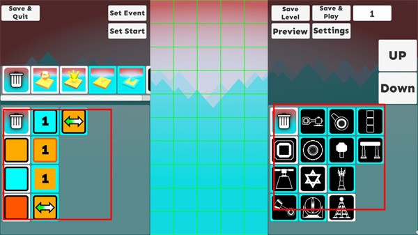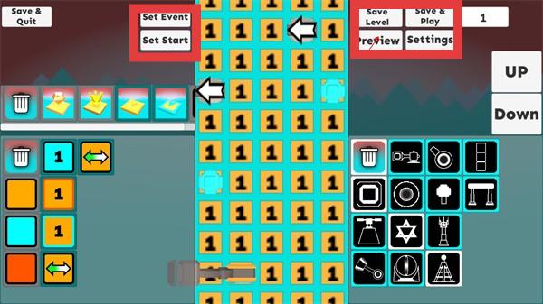 1、进入游戏关卡编辑界面,熟悉左右两侧的工具按钮。左侧工具用于设置基础元素,右侧工具提供功能组件,合理搭配使用来构建关卡。