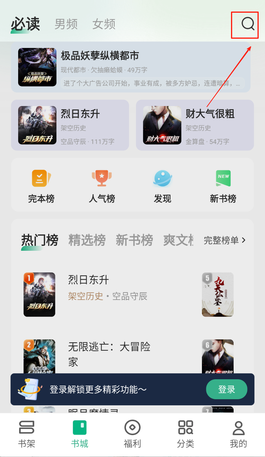 1、书城页通过分类榜单或关键词检索目标小说,点击加入书架自动记录章节位置。