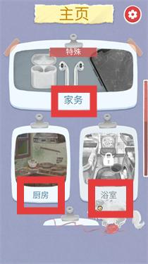 1、进入游戏主页,可看到“家务”“厨房”“浴室”等板块分类,根据需求选择进入不同场景,如点击“厨房”进入厨房清洁任务场景。