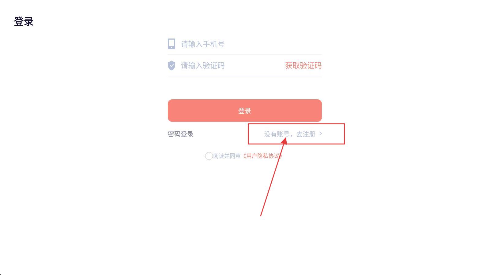 1、打开应用,在【登录】界面点击【没有账号,去注册】,进入注册操作环节。