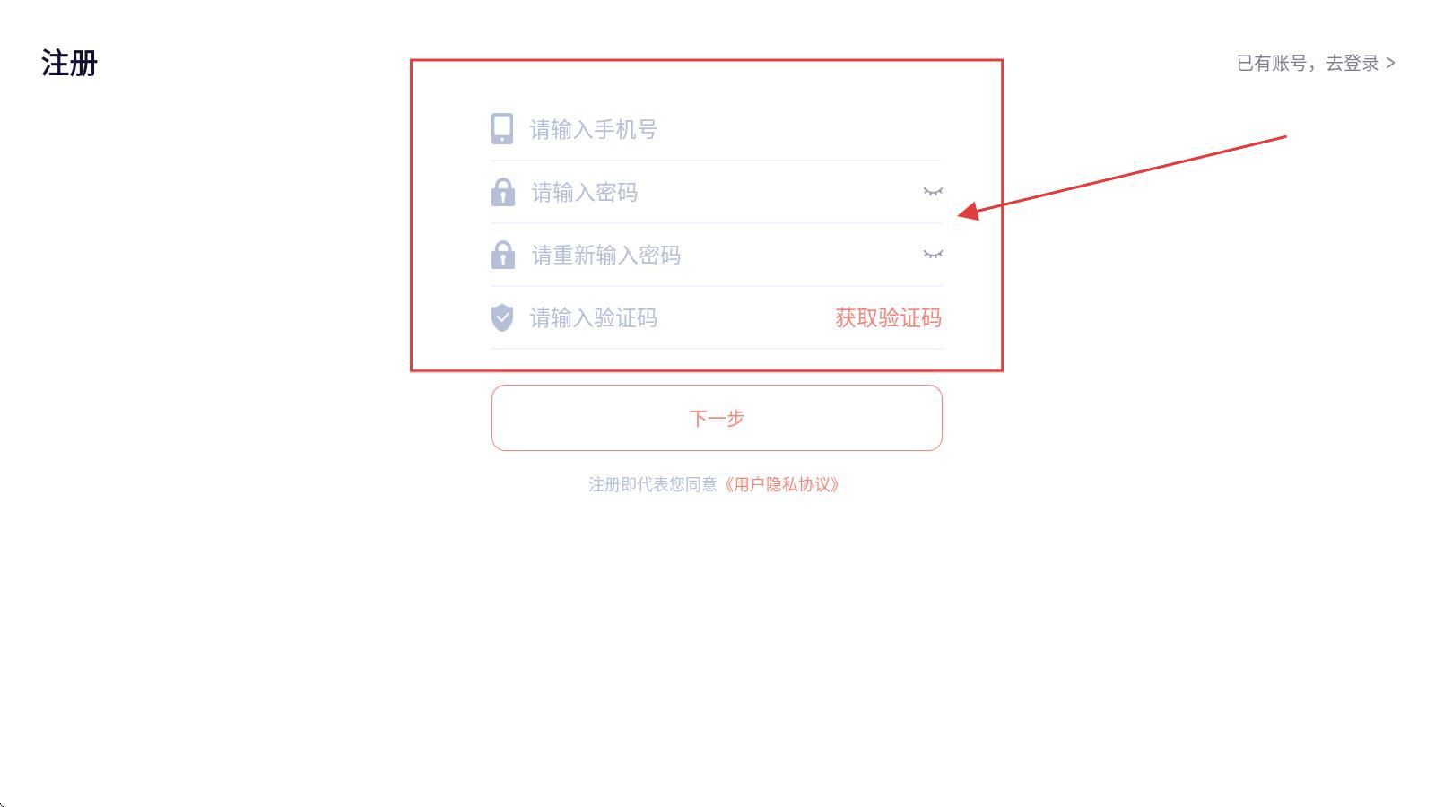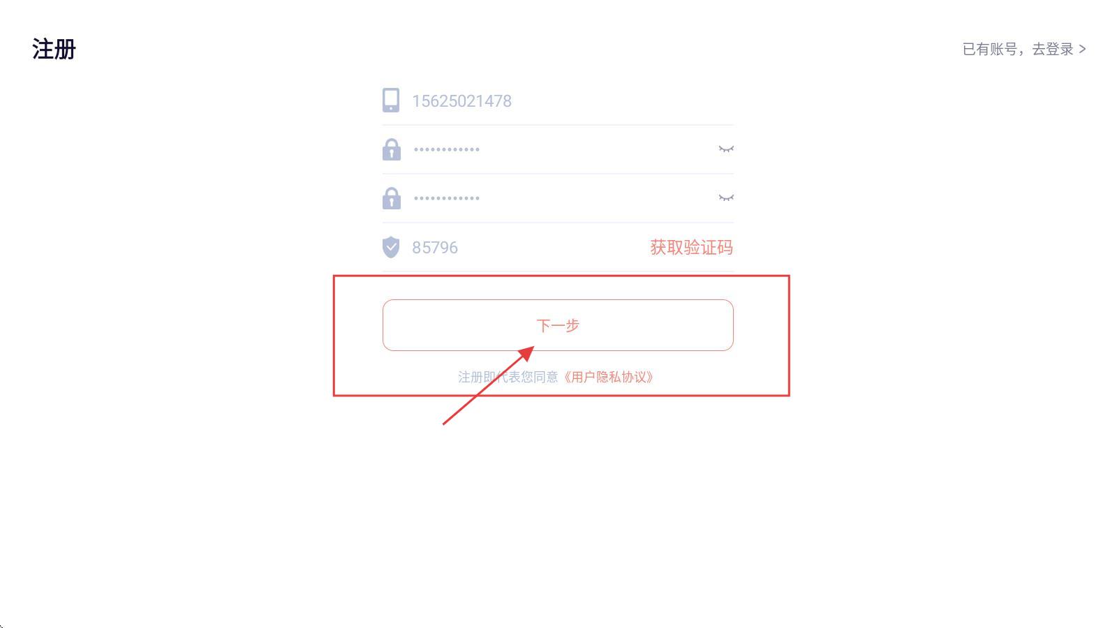 2、在注册页,点击输入框区域,依次输入手机号、密码、确认密码,点击【获取验证码】并填入。