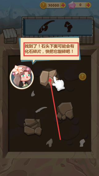1、在考古挖掘环节,根据提示,点击场景中的石头,获取化石碎片,逐步拼凑完整恐龙化石。