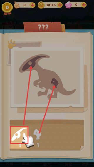 2、收集到化石碎片后,在图鉴界面将碎片对应放置到恐龙轮廓处,完成恐龙化石的复原,解锁新的恐龙种类。