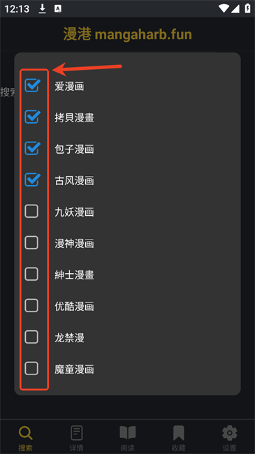 2、在弹出的源站列表,勾选目标漫画源(如爱漫画、拷贝漫画等),完成源站设置。