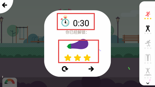 2、注意游戏中的计时机制(如0:30),在规定时间内完成动作挑战,争取获得三星评价(如解锁茄子图标),获取奖励并解锁新内容。