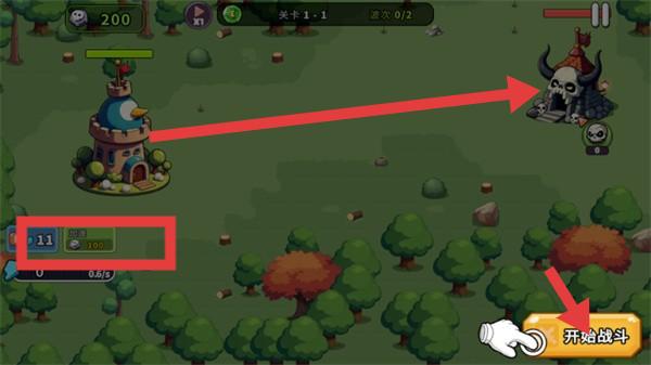 1、游戏开始时,注意屏幕上显示的资源数量(如11和100),这是前期可利用的重要资源,合理规划使用。点击“开始战斗”进入战斗环节。