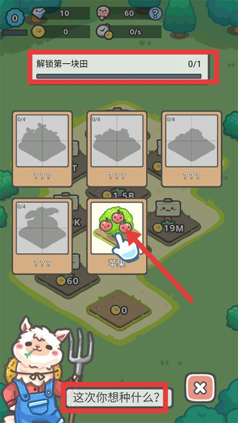 1、游戏开始,聚焦于“解锁第一块田”任务,点击选中如“苹果”等作物地块,明确种植目标,开启农田经营第一步。