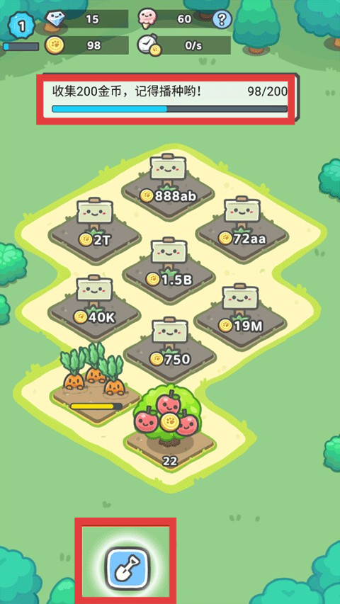 2、依据任务提示,通过点击地块获取金币收益,当金币积累达标后,点击下方工具图标(如铲子)进行播种操作。