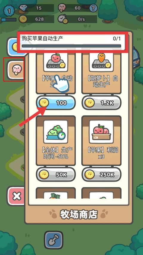 3、进入牧场商店,利用积累的金币购买“苹果自动生产”等功能道具,提升生产效率,完成“购买苹果自动生产”任务目标。