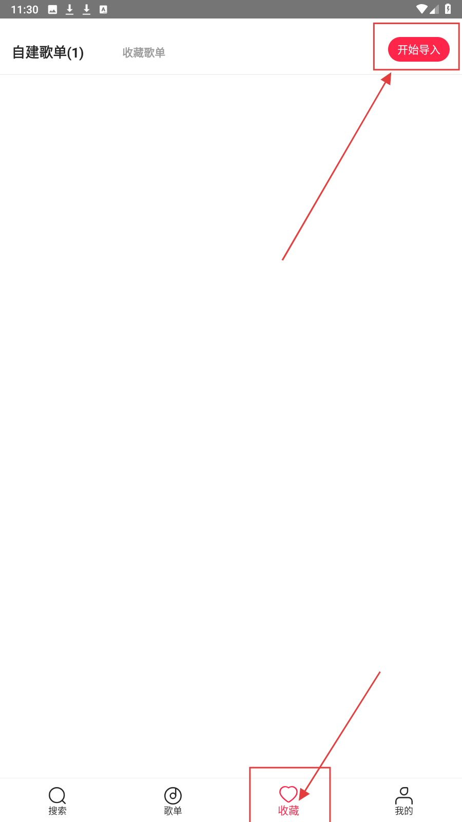 1、进入【收藏】页,点击【开始导入】,进入歌单导入流程。
