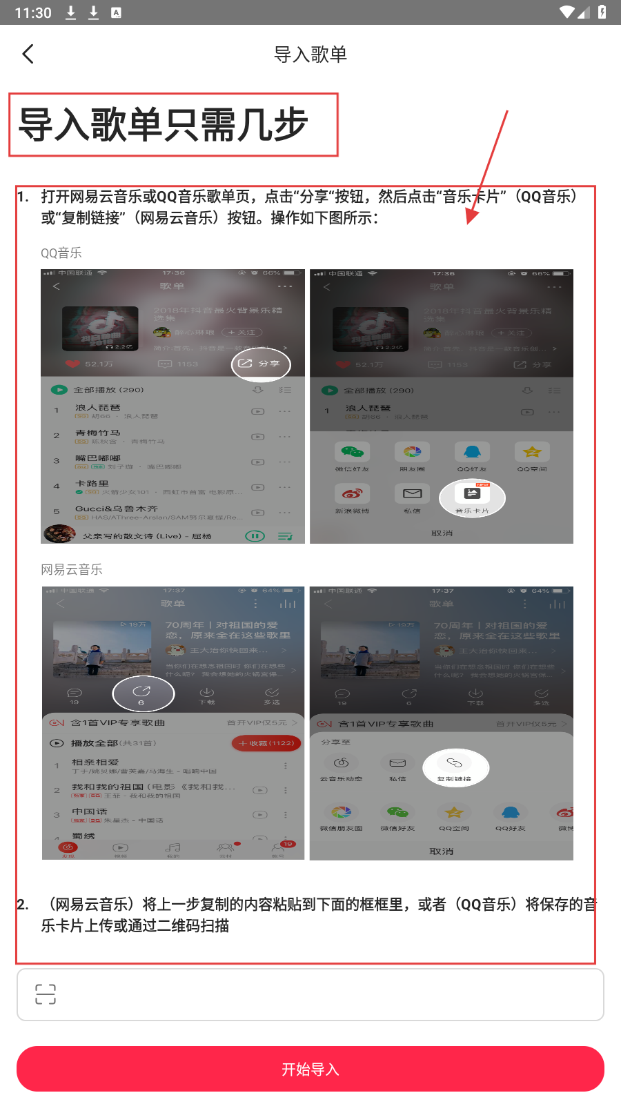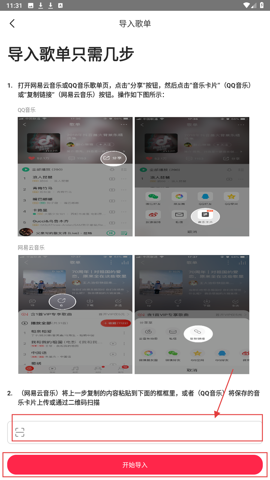 3、将复制内容粘贴(网易云)或上传音乐卡片/扫码(QQ音乐)到输入框,点击【开始导入】,完成歌单导入任务。