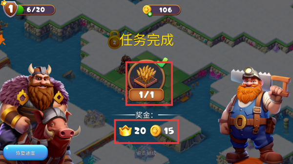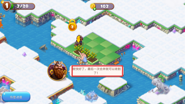 1、游戏中,留意屏幕提示,按照指引完成作物合并与收割任务(如收割小麦),获取任务奖励(如20皇冠、15金币)。