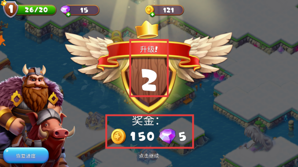 2、积累任务进度,当完成任务要求后,可获得升级奖励(如升级到2级,获得150金币、5颗宝石),提升游戏资源储备。