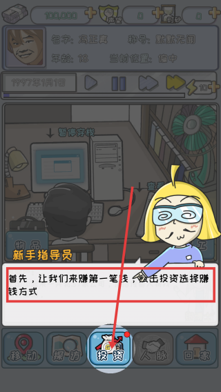 1、初入游戏,跟随“新手指导员”提示,点击“投资”按钮,从多种赚钱方式中选择合适的进行投资,开启资金积累之路,增加初始资金。