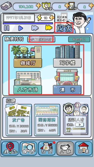 2、利用“探访”功能,前往“咖啡厅”“写字楼”“人才市场”“集市”等场所,尝试“发现传奇人才”,为后续发展招募人才,提升公司实力。