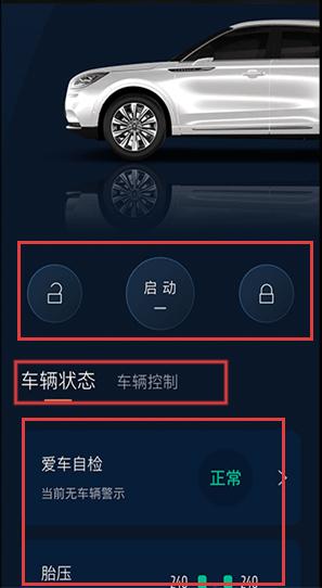 1、打开应用,可查看车辆状态(自检正常、胎压等),使用锁车、启动等基础控制。