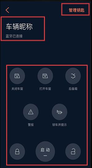 2、进入【管理钥匙】页,可设置车辆昵称,远程控制车窗、后备箱等,管理车辆钥匙权限。