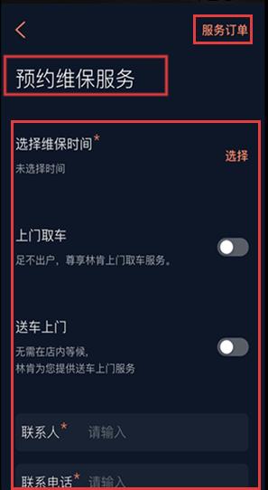 3、打开【服务订单】-【预约维保服务】,选时间、填联系人/电话,开启上门取送车维保,完成车辆维保预约。