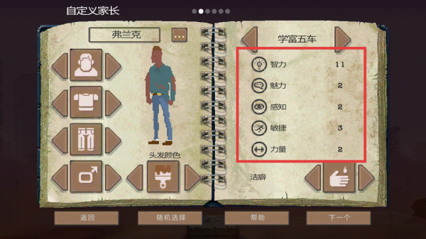 1、游戏开始,在“自定义家长”环节,可根据需求调整角色属性和外观,也可点击“随机选择”快速生成,确定角色后点击“下一个”。