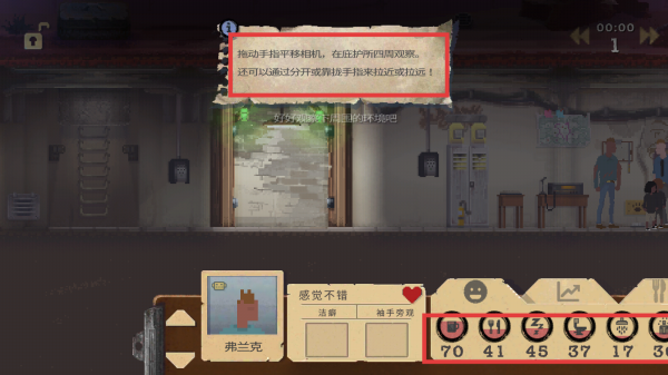 2、进入庇护所场景,按照提示,熟悉场景操作,留意底部状态条,关注角色状态。