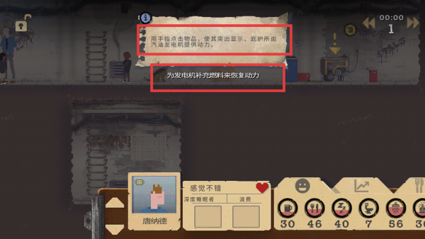 3、利用“用手指点击物品,使其突出显示”的操作,探索场景寻找资源。当提示“庇护所由汽油发电机提供动力”时,找到燃料为发电机补充。