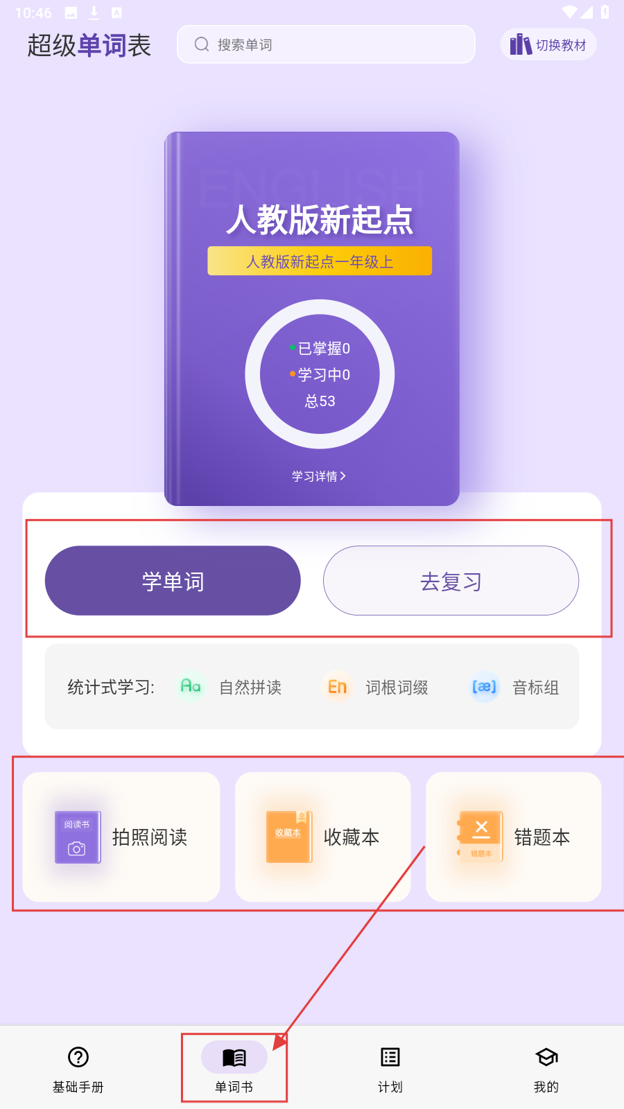1、打开APP,在【单词书】页选,点【学单词】/【去复习】学习,用拍照阅读等工具辅助。