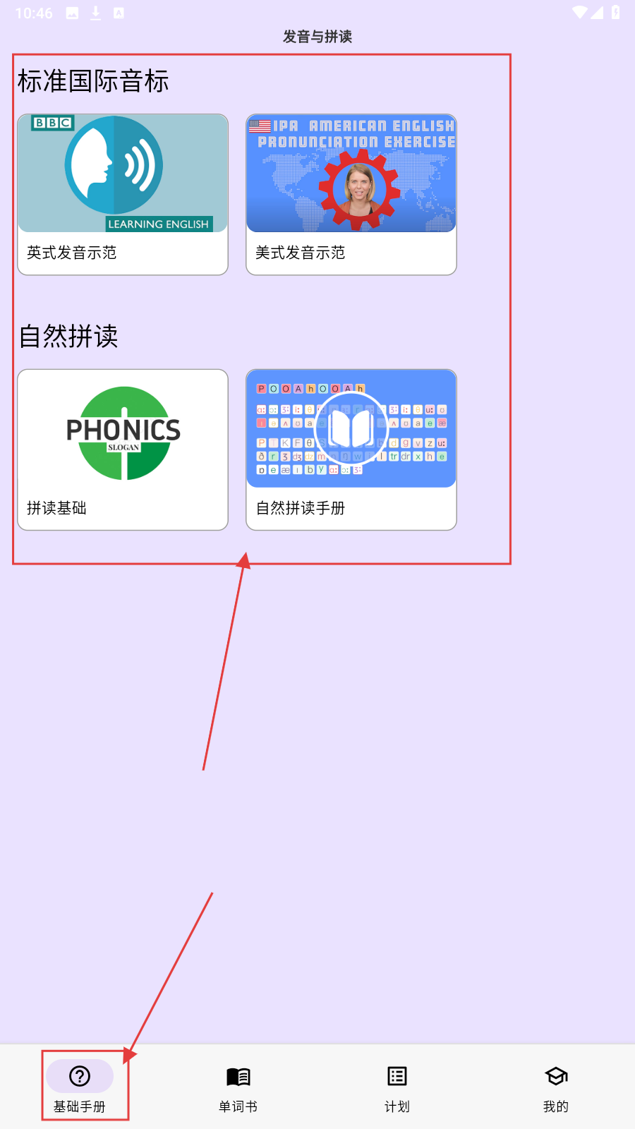 2、切换【基础手册】,学发音(英式/美式)、自然拼读(拼读基础、手册)。