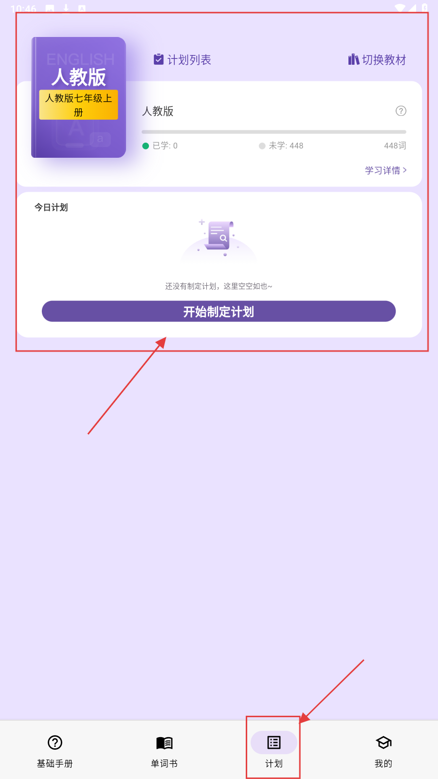 3、进入【计划】页,点【开始制定计划】,设置单词学习计划,按计划学习。