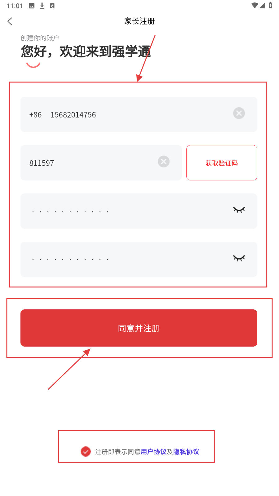 3、以家长为例,填手机号、验证码、密码,勾选协议,点【同意并注册】,完成账号注册。