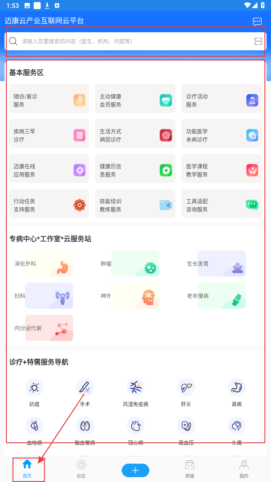 1、打开APP,在底部点【首页】,进入首页,可使用搜索、查看基本服务、专病中心、诊疗+特需服务。