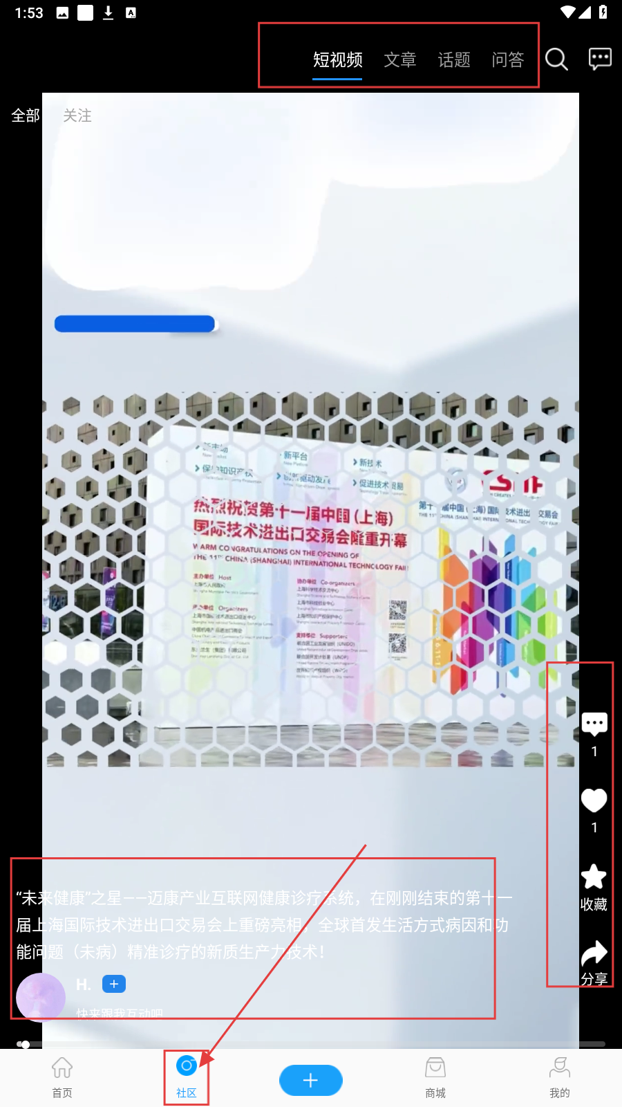 2、点底部【社区】,进入社区页,可浏览短视频、文章、话题、问答,参与互动(点赞、收藏等)。
