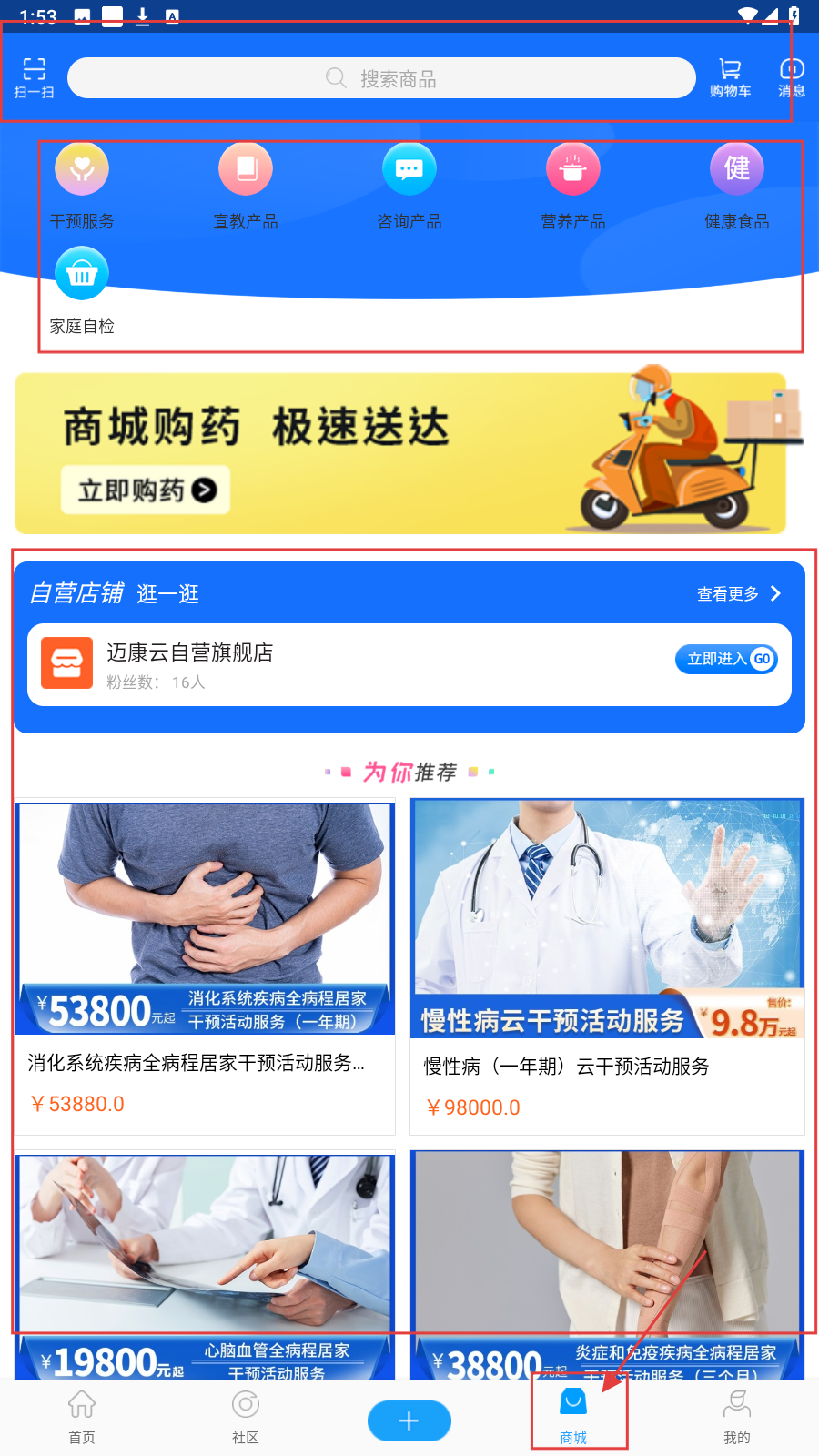 3、点底部【商城】,进入商城页,可搜索商品、查看分类(干预服务等)、逛自营店铺(迈康云自营旗舰店)、购买健康服务/产品。
