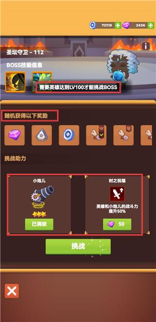 3、面对BOSS挑战,注意BOSS技能信息和挑战条件。利用挑战助力道具提升战斗力,再点击“挑战”,随机获取丰厚奖励。