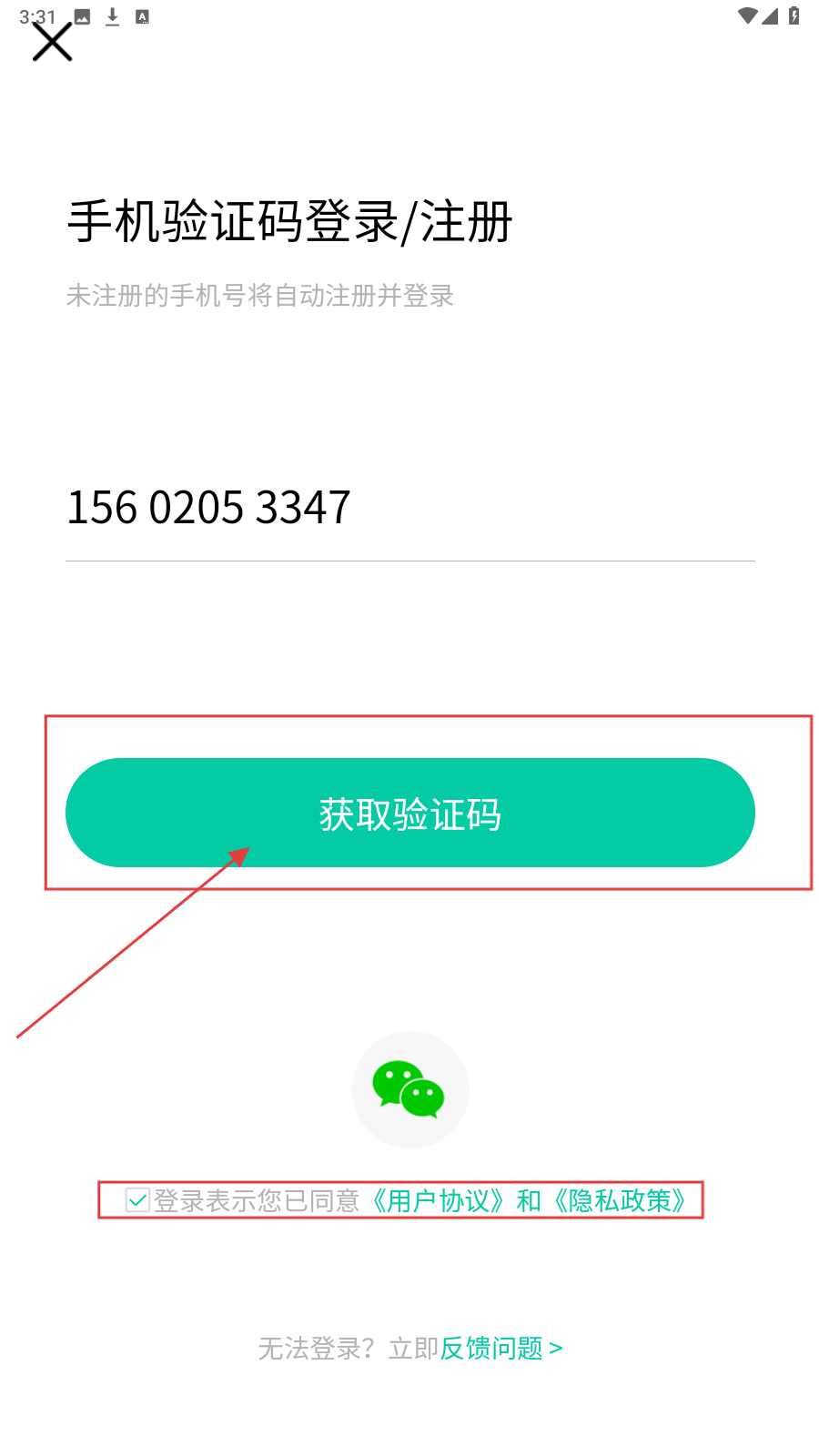 2、勾选同意协议,点【获取验证码】,接收验证码。