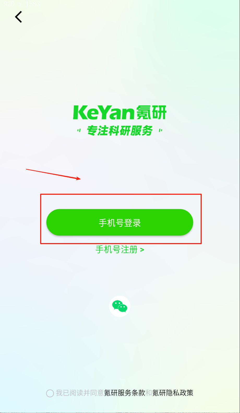 1、打开氪研软件呀,起始界面很清爽,找到那个绿色的“KeYan氪研”标志,点击“手机号登录”按钮就可以准备输入啦。