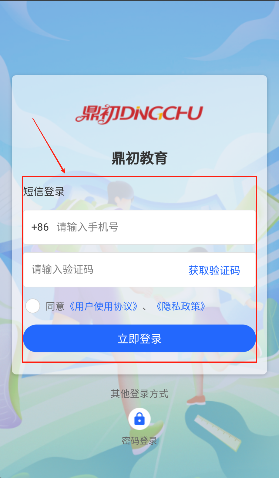 1、要短信登录就点开应用在蓝白背景页找"短信登录"呀,输完"+86"后的手机号点"获取验证码",收到数字填进去勾选服务条款。