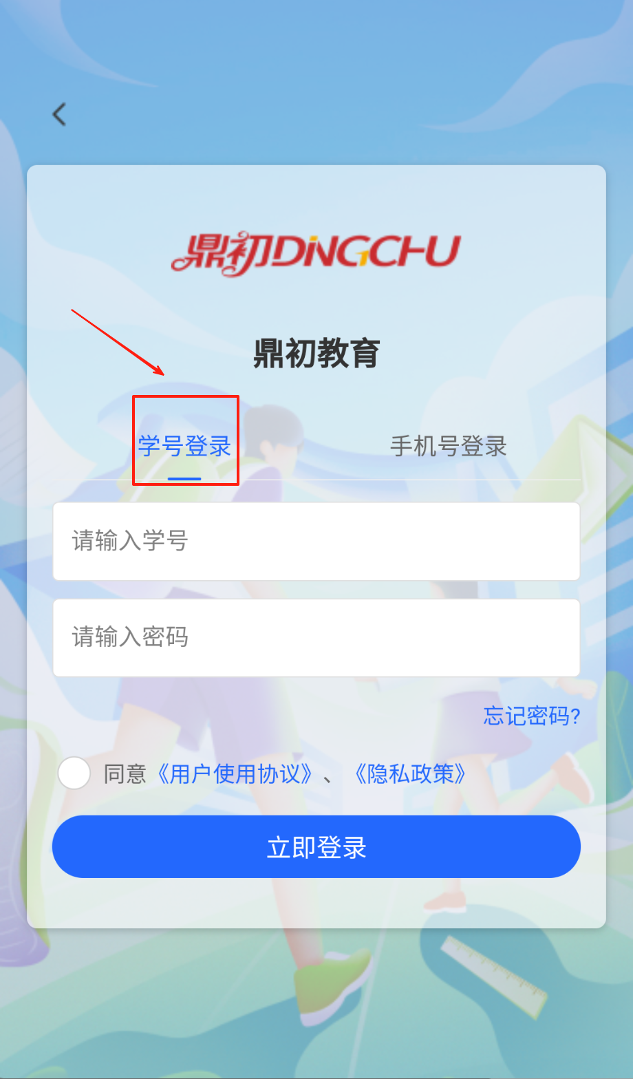 2、用学号登录得在选项里选"学号登录"喏,填入学号密码注意别输错,勾选下方协议对勾点"立即登录"就能轻松进入。