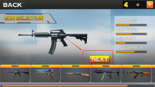 2、如何选择合适的武器?在“GUN SELECTION”界面选择武器,并点击“NEXT”按钮确认。