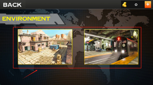 3、如何选择游戏环境?在“ENVIRONMENT”界面选择游戏场景,然后点击选择的图片进入游戏。