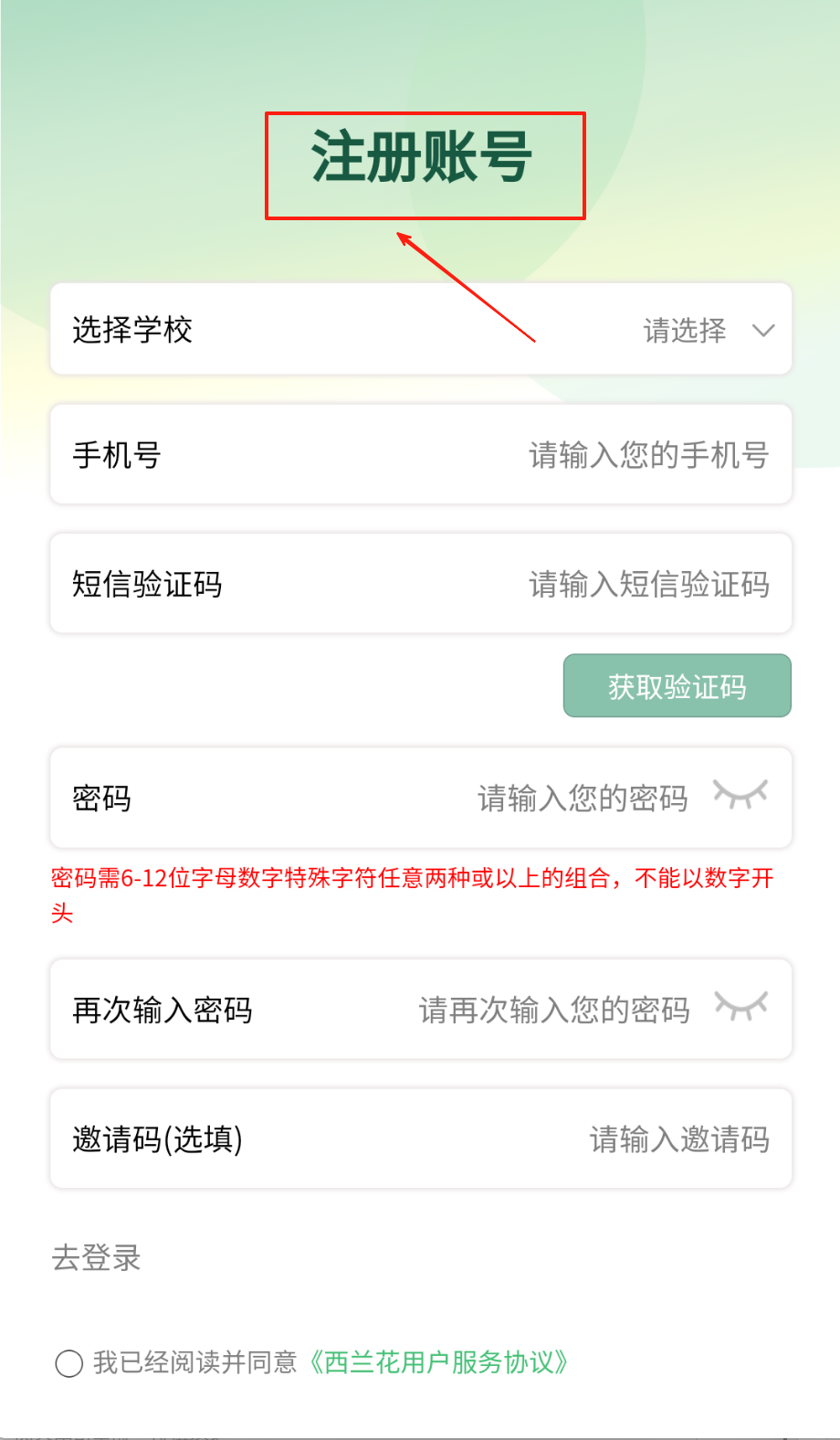 2、注册新号要仔细呢,在选择学校下拉栏找自己学校,填手机号收验证码设密码,密码需字母数字组合别用纯数字开头,最后勾协议注册呗。