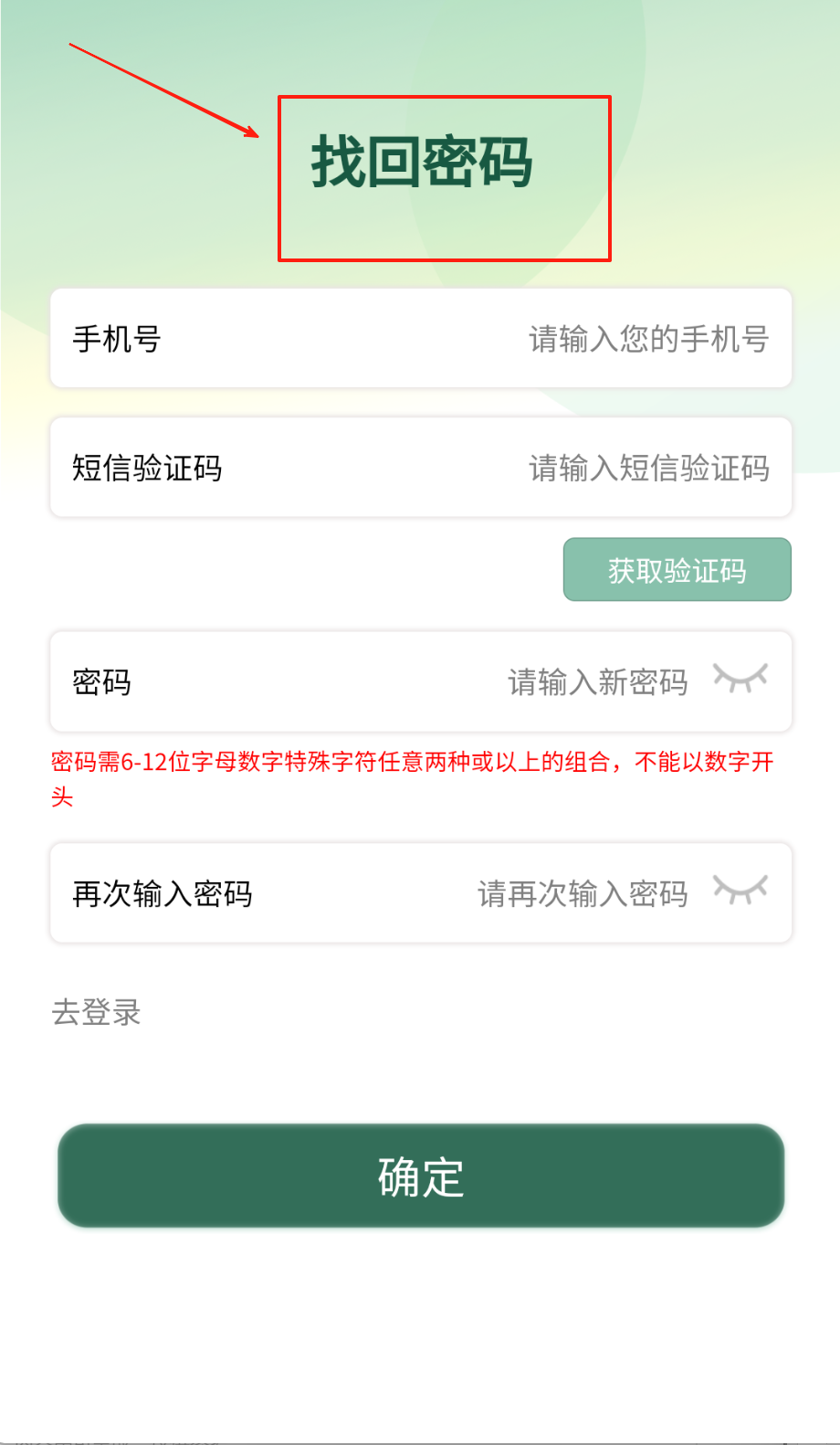 3、找回密码不着急啊,在忘记密码页填注册手机号获取验证码,设新密码时注意6-12位混合格式确认两遍,点确定按钮就行啦。
