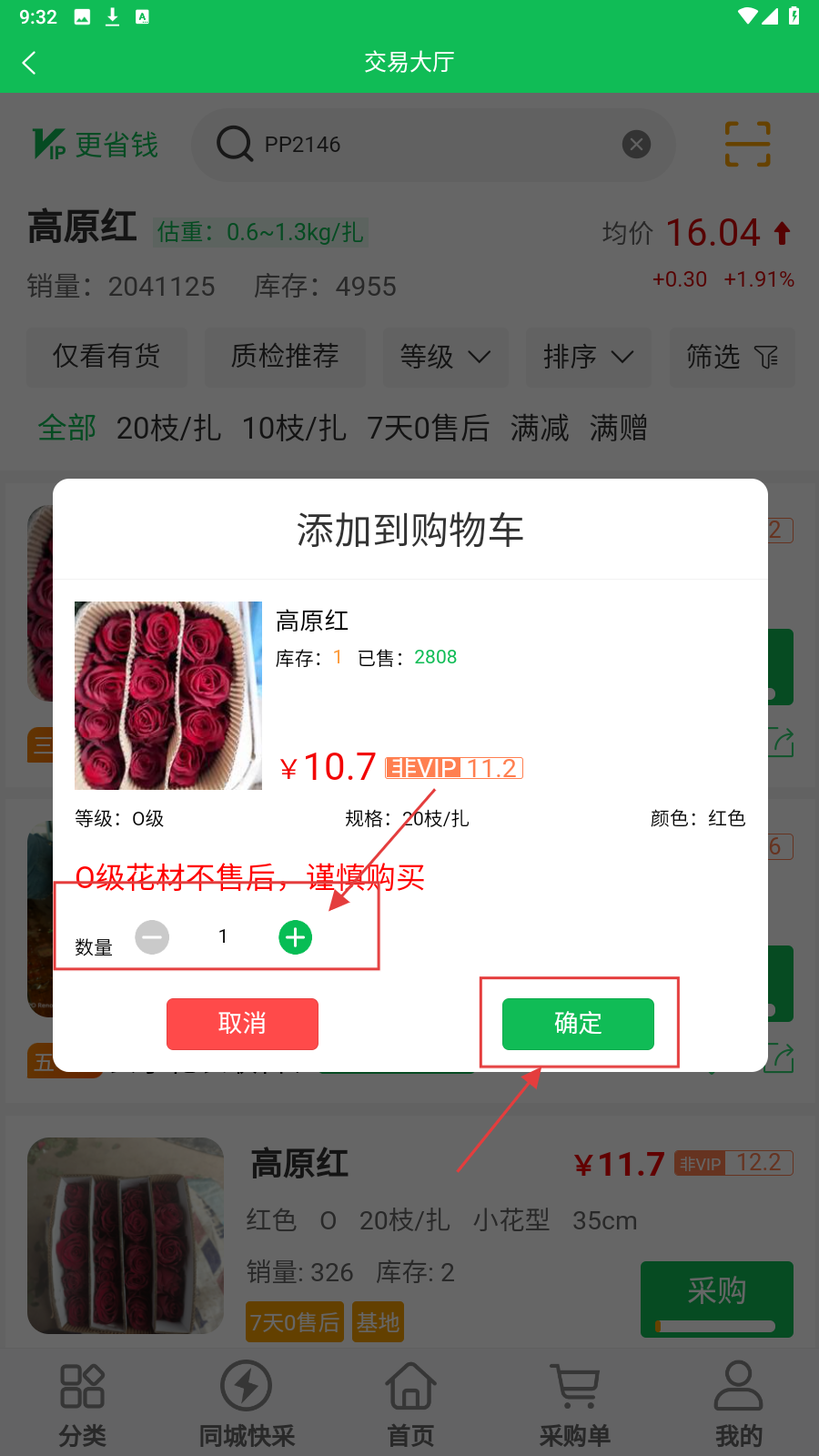 3、在交易大厅点击商品旁【采购】按钮,弹出“添加到购物车”弹窗,按需调整数量后点【确定】即可进行下单。