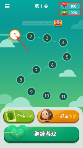 1、游戏开始,在关卡选择界面,关注右上角生命值和能量值。点击关卡数字开启游戏,也可通过“继续游戏”按钮,从上次进度继续。