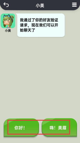 3、后续对话中,根据小美回复和提示,不断选择正确选项(如“你好!”“嗨!美眉”),逐步增加好感度,朝着“约出来”目标推进。
