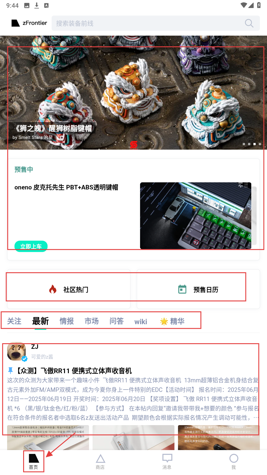 1、打开APP,在底部导航点【首页】,页面显示商品推荐,还有社区热门、预售日历及关注、最新等板块,点击对应内容使用。