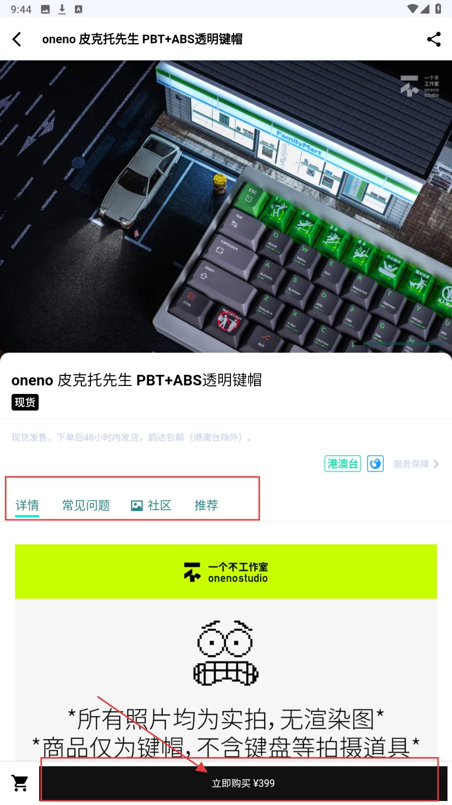 3、进入商品详情页,页面显示商品实拍图、详情/常见问题等标签,点击【立即购买】按钮可跳转下单。