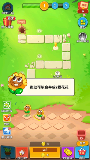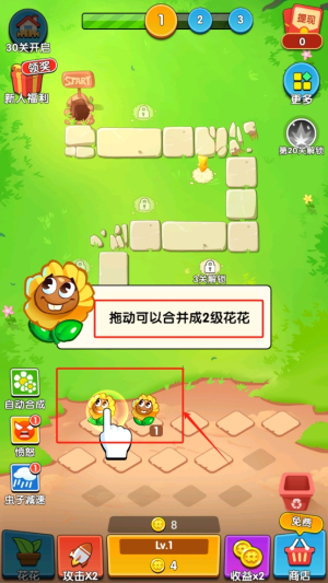 3、合并升级:拖动相同等级的花花进行合并,升级成更高级别的花花。