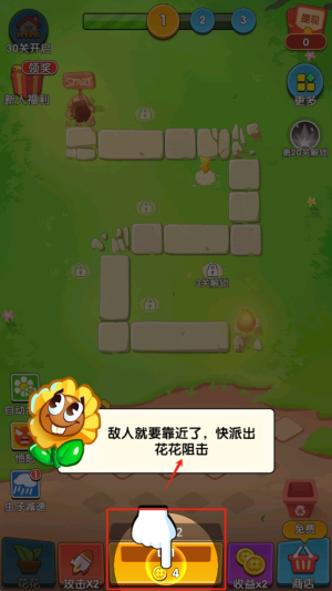 2、开始游戏:点击屏幕下方的箱子,派出花花进行攻击。